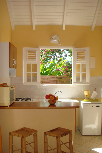 - Petite cuisine avec 4 feux gaz, un réfrigérateur, un micro-ondes, une cafetière et un grille-pain.